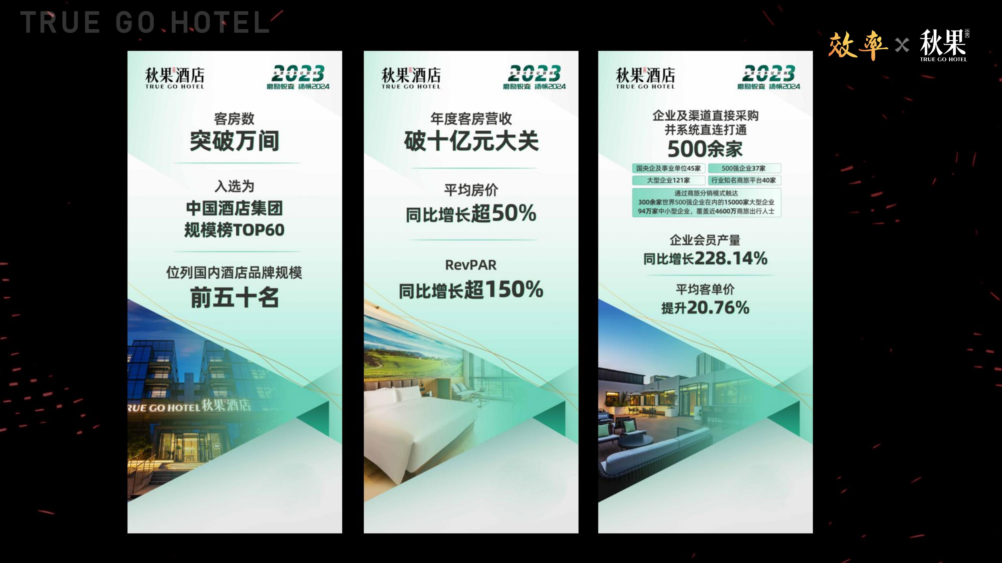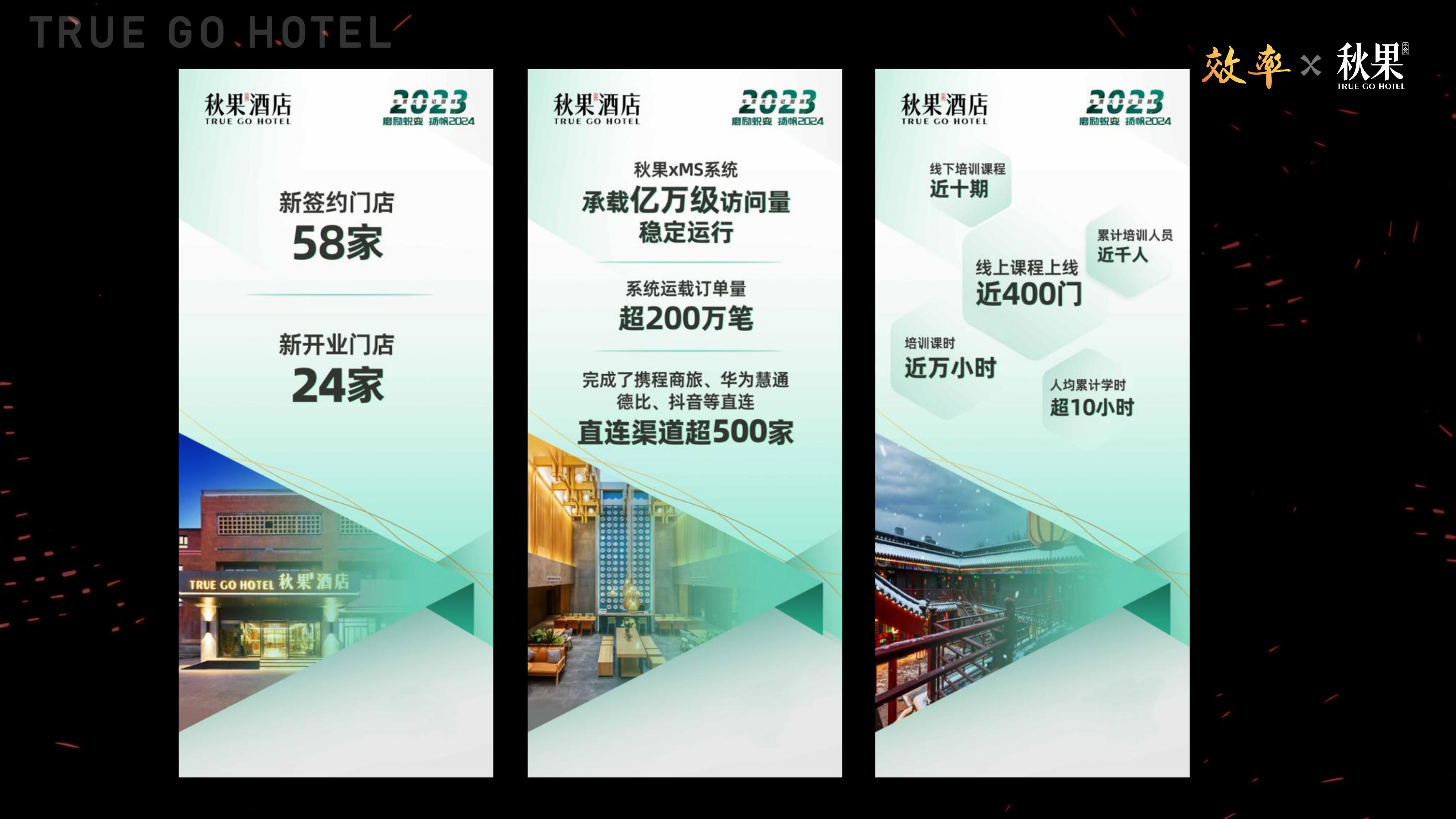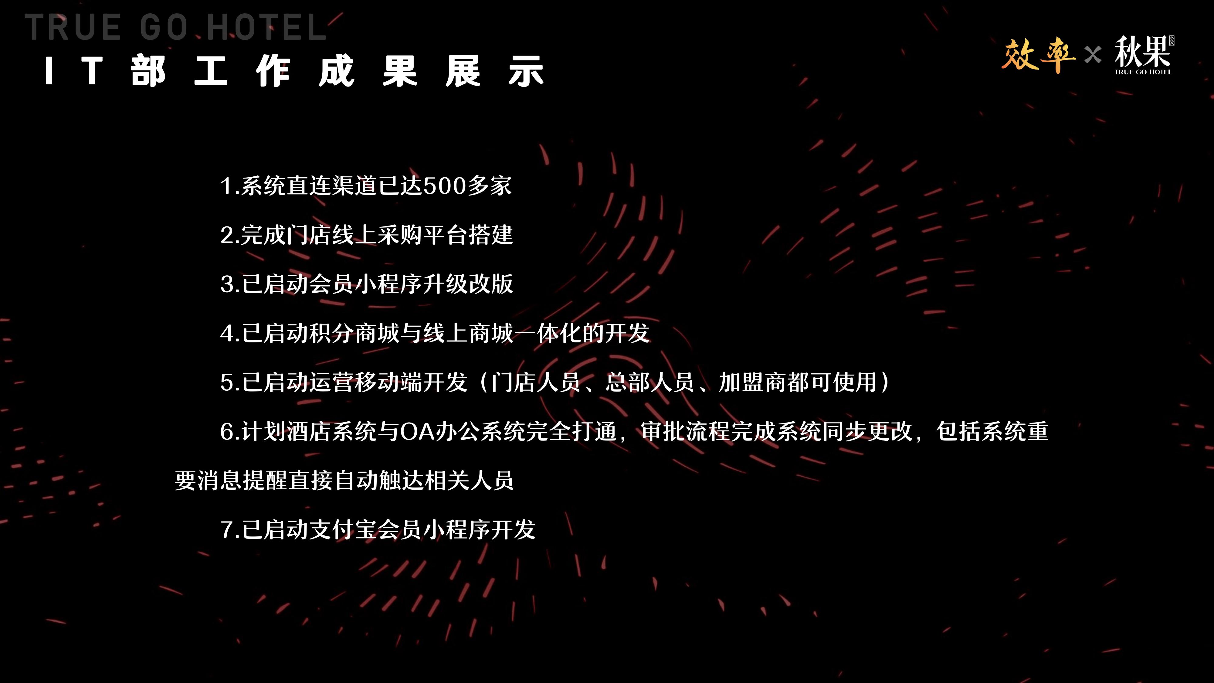 我们的xMS系统承载了亿万级访问量,系统很稳定,订单量超过200万笔。我们完成了携程商旅、华为慧通、德比、抖音等超500家的系统直连。我们的IT团队值得大家掌声,大家掌声来,谢谢大家。我一直很崇尚左晖和庄辰超,他们两个人都用互联网技术把线下实体业务打通的。我要是会电脑,今天肯定不是这个样子,所以你们得帮我做好加持。
